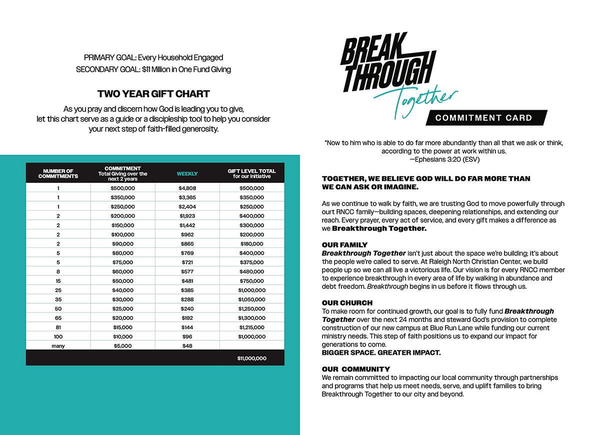 Breakthrough Together is a two-year spiritual journey and generosity initiative as we pursue 100% participation and believe God for $11 million to expand the impact of Raleigh North Christian Center.