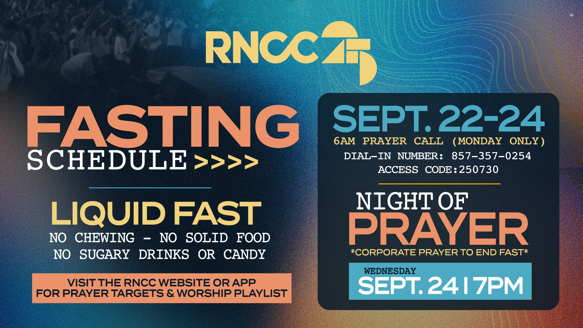 Join us for a time of corporate fasting.  Sept. 22-24, ending with a night of prayer on Wed. Sept. 24.  6am conference Call (Monday Only) Prayer Conference Call Info:Dial-In Number: 857-357-0254Access Code: 250730
