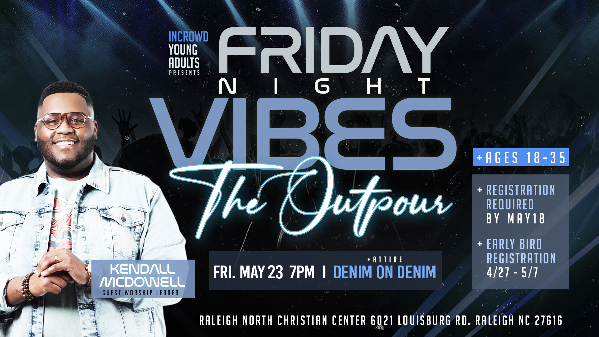 What’s up Young Adults 18-35! We’re back at it! Come hang out with INCROWD on Friday May 23 from 7-9 pm for “ Friday Night Vibes: The Outpour”! We are bringing in national recording artist and producer Kendall McDowell and his squad to the stage, and we plan to bring HEAVEN DOWN! Attire: Denim on Denim (Casual) Registration: Required by May 18