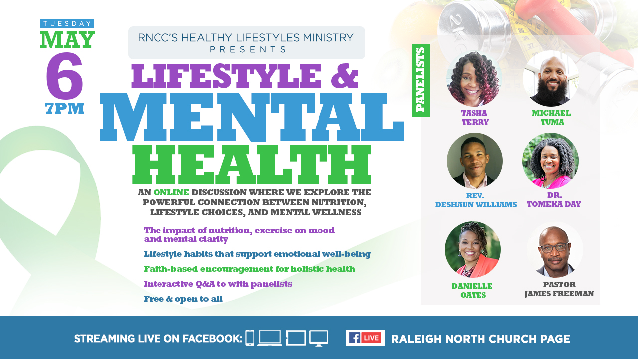 The Healthy Lifestyles Ministry is excited to partner with the Mental Wellness Ministry for an engaging and interactive online discussion on Tuesday, May 6, 2025, at 7:00 PM! We have a powerful panel of professionals that will help us explore the powerful connection between nutrition, lifestyle choices, and mental wellness. This collaborative session will provide practical insights, expert guidance, and real-life strategies to help you nurture both your body and mind. 📅 Date: Tuesday, May 6, 2025 ⏰ Time: 7:00 PM 📍Virtual (View via RNCC FB or Youtube) FREE & OPEN TO ALL! (No registration required)