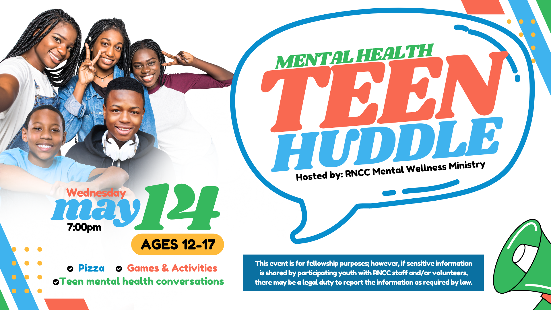 The RNCC Mental Wellness Ministry will be hosting a Teen Huddle for all teens 12-17. There will be pizza, games, activities and discussions on teen mental health topics. Disclaimer: This event is for fellowship purposes; however, if sensitive information is shared by participating youth with RNCC staff and/or volunteers, there may be a legal duty to report the information as required by law.