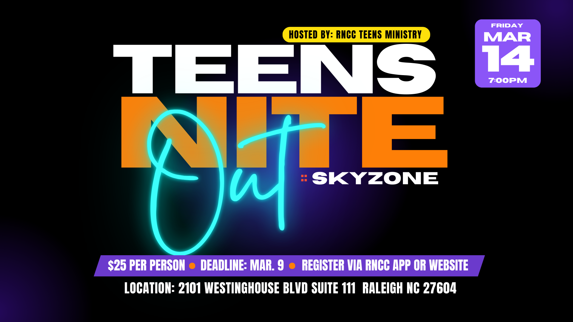 All teens age 12-17 Join us for Teens Nite Out on March 15th at 7 pm for some fun at Skyzone! Can't wait to see you there – it's going to be a fantastic night! 📅 March 14, 2025 ⏰ 7 PM – 9 PM 📍 2101 Westinghouse Blvd Suite 111 Raleigh NC 27604🔗 Registration Deadline: Mar. 9