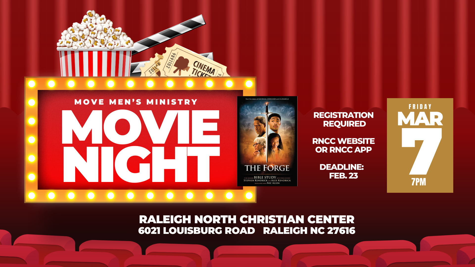 Join the Men’s Ministry at Raleigh North Christian Center for an inspiring movie night featuring Forge! Enjoy a powerful film about resilience, brotherhood, and faith, along with popcorn, drinks, and great conversation.  Don’t miss this night of connection and inspiration—secure your spot today! 📅 March 7, 2025 ⏰ 7 PM – 9 PM (Doors open at 6 PM)📍 RNCC🔗 Registration required by Feb. 23