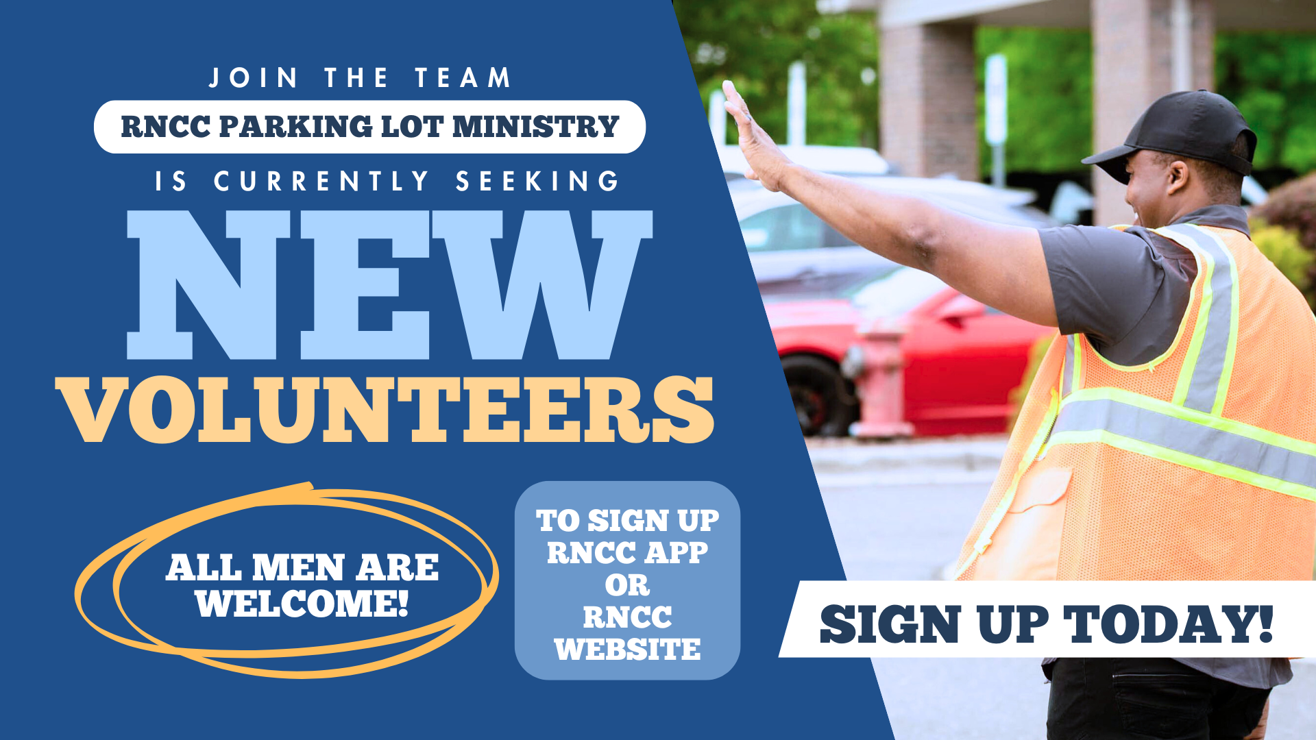 JOIN THE TEAM! The RNCC Parking Lot Ministry is looking for volunteers to help keep things running smoothly, especially with two services. As the first faces people see when they arrive, you’ll play a key role in making sure everything flows effortlessly and everyone gets in and out quickly. By joining this team, you’ll help set the tone for an amazing experience from the moment people arrive.